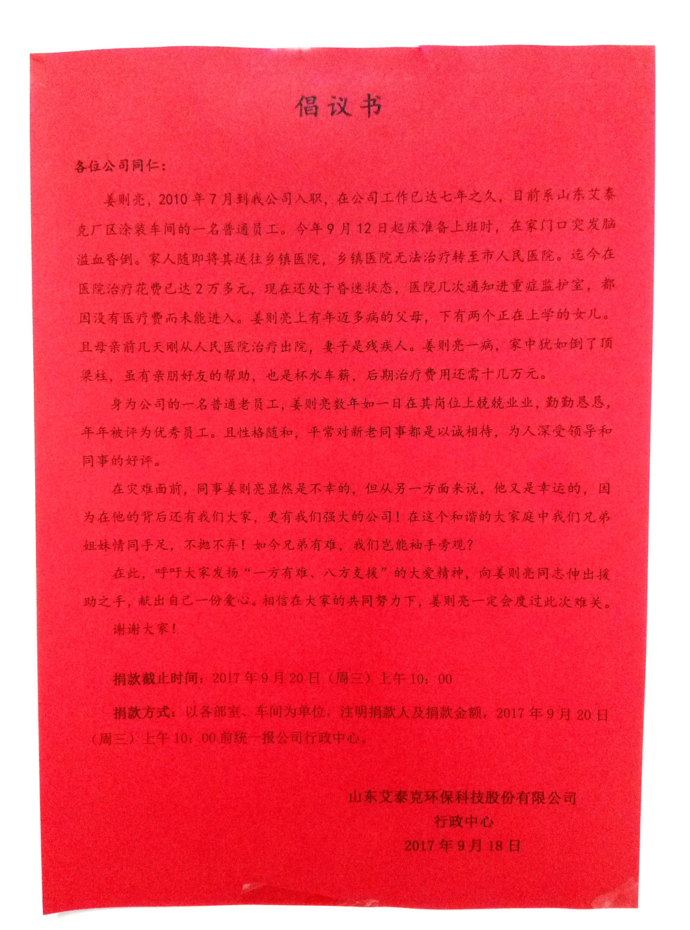 公司领导闻悉此情况后,由行政中心牵头倡议举行爱心捐款活动,号召公司全体员工伸出援助之手,积极为姜则亮同志捐款,用实际行动支持患者与病魔作斗争。这一倡议立即得到了公司全体员工的积极响应。公司两厂区领导率先捐款,短短两天内,共募集爱心捐款35789元,并第一时间交到姜则亮家属手中。交接现场家属向公司递交感谢信,感谢艾泰克公司及每一位同事对姜则亮同志的支持与关怀。